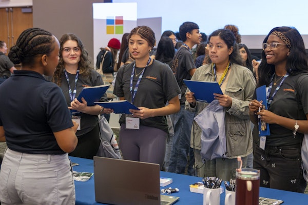 Graduating high school seniors hear about technical training opportunities through Per Scholas during the OneGoal Texas Student Summit in Houston on March 25, 2025. (Kirk Sides/Houston Chronicle via Getty Images)