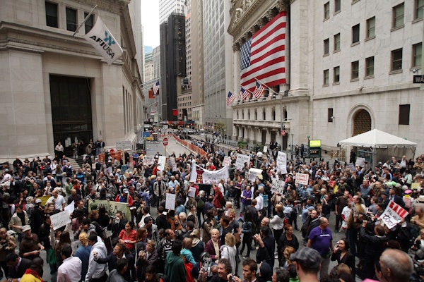 A protest outside the New York Stock Exchange during the global financial crisis on Sept. 25, 2008. (AP Photo/Spencer Platt)